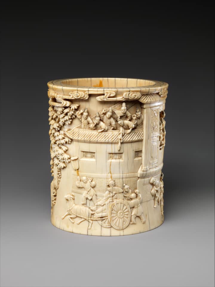 The image of Wei Jie driving his harness goat became cemented in Chinese folklore, and continued to capture the imaginations of artists in the region, for centuries. Both depictions here, are in the Met Museum, and date from the 18th century. The first is a ceramic plate, and the 2nd is an ivory brush holder. The goat on the ivory brush holder wears a sturdy pulling collar; an invention that can be traced back to northern China, during the 3rd century.