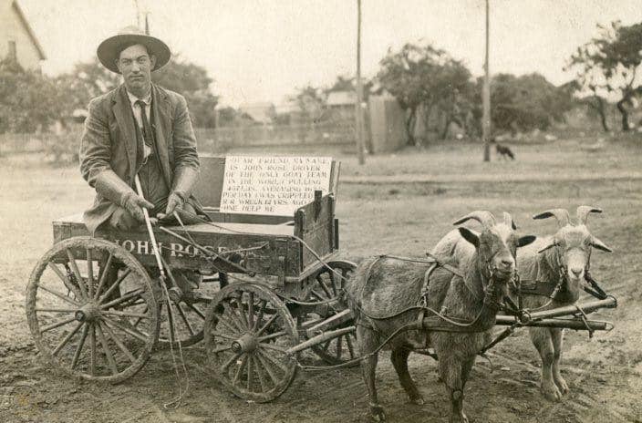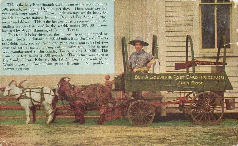 John Rose, known as Overland Jack, was a teamster, watch and gun repairman, and double amputee, who logged over 30,000 miles in his compact covered wagon, pulled by hitches of rugged Spanish goats. Below, is an article about him, from texashighways.com , called The Goat Man of Big Sandy, written by Gay Ingram, of Big Sandy, Texas: