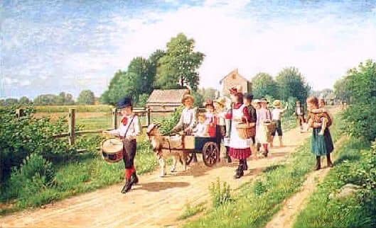 Samuel S. Carr was a prolific pastoral genre painter who lived from 1837 – 1908. Although born in England, he lived most of his life in NY, with his sister and brother-in-law, working as a career painter. He was heavily inspired by the rural landscapes, quiet suburbs, and seaside vacation spots of the northeastern United States, and his work includes quite a few goat carts, several examples of which are on the right, and below. If you look closely, you can see a certain goat making multiple appearances