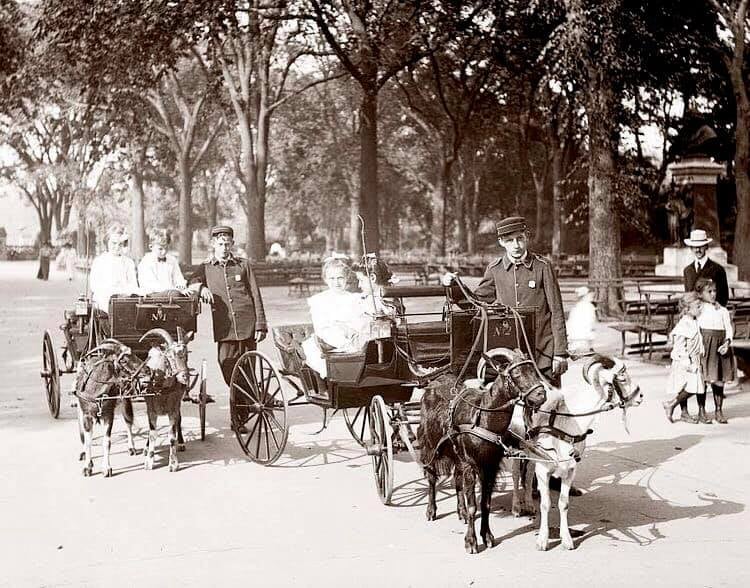 In 1902, E. Mars and M. H. Squire published a children’s book called ‘Children of our Town.’ It features an illustrated poem by Carolyn Wells, about the goat carriages that would offer rides along the mall, in Central Park, including a gently humorous reminder not to push their weight limit. On the right are some photos of these beautiful little goat carriages, and their smartly dressed handlers. Let’s go for a crawl along the mall: